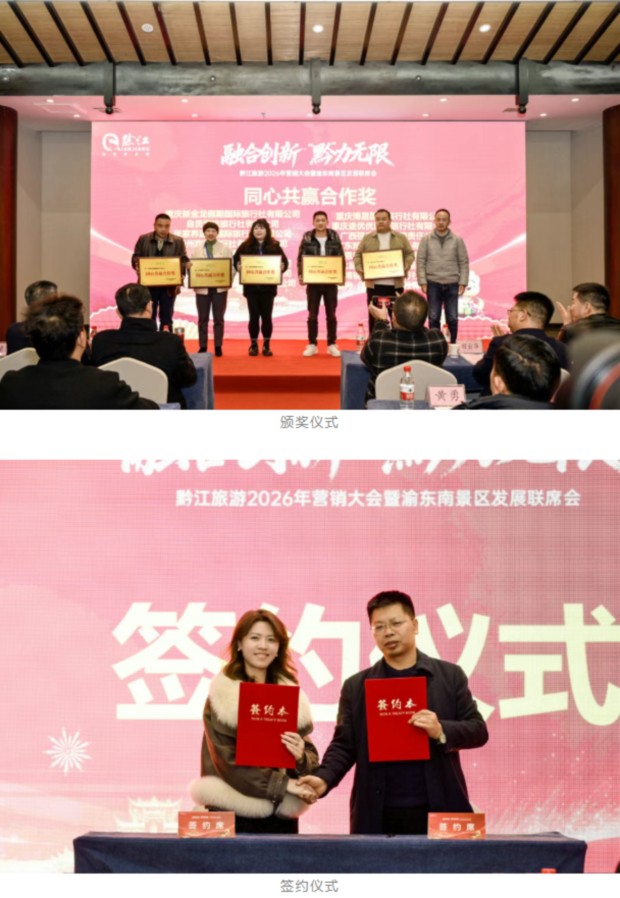 区域文旅一体化发展,离不开政策赋能与市场聚力的双向驱动。会议期间,一系列提振市场的务实举措接连发布。现场发布了备受关注的《2026年黔江旅游奖励政策》及稽核办法,以“真金白银”激励渠道商深耕市场。大会促成了8家战略合作伙伴的集中签约,并为30家杰出合作伙伴颁奖,进一步稳固了区域高质量发展的“市场基本盘”。